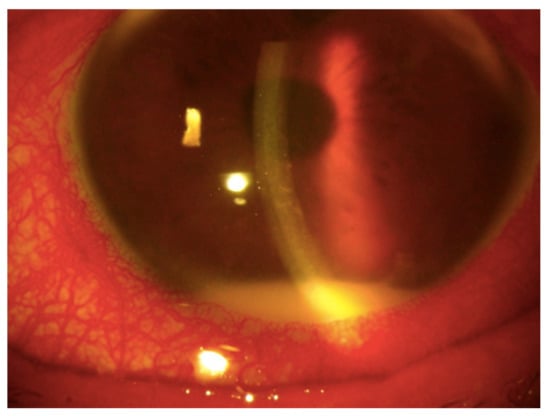 Aqueous humor sampling is especially valuable diagnostically in patients with masquerade syndromes, in the presence of a hypopyon (Figure 1), a typical sign of active acute AU. The hypopyon consists of a collection of inflammatory cells, mostly granulocytes and possibly malignant lymphoid cells, in the lower angle of the AC. A herpetic etiology can be suspected in patients with iris atrophy, pigmented keratic precipitates, endotheliitis, or ocular hypertension [15,16]. Herpetic infections usually manifest as non-granulomatous uveitis in acute cases and as granulomatous uveitis in chronic cases [17,18]. Detection of the pathogens responsible for infectious uveitis, besides cytopathological examination and microbiological tests, currently relies on PCR analyses of the AH sample, which is easier to obtain than vitreous. By using a minimum volume of 0.05 mL of AH through PCR, specific DNA sequences can be amplified to provide fast identification of specific pathogens [18,19]. The GWC provides additional data to determine the pathogenic level of the virus load [10]. Combining PCR, GWC, and WB has significantly increased the diagnostic sensitivity of PCR by up to 97% [20].