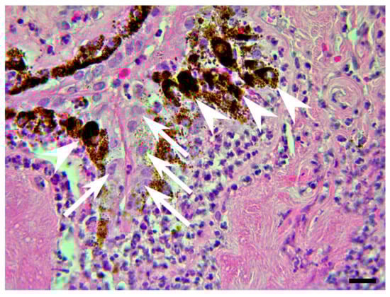 Ciliary body biopsy from a 90-years-old male with acute suppurative endophthalmitis. Hematoxylin and eosin (H&E) staining shows a massive influx of polymorphonuclear neutrophils that fragments the fibro-muscular tissue of the ciliary body and also displaces and compresses the pigmented (arrowheads) and non-pigmented (arrows) layers of the ciliary epithelium. Magnification: ×400; scale bar: 30 μm.