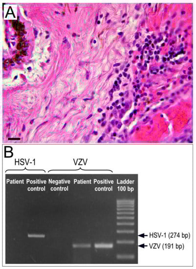 Ciliary body biopsy from a 66-year-old female with chronic non-granulomatous endophthalmitis. (A) H&E staining reveals lymphoplasma cellular infiltrates and micro-hemorrhagic events in the fibro-muscular structure of the ciliary body, close to the ciliary epithelium. Magnification: ×400; scale bar: 30 μm. (B) Polymerase chain reaction (PCR) analysis performed to detect Herpes simplex type 1 (HSV-1) and varicella zoster virus (VZV) DNA (using the following primers, HSV-1-for, 5′-CTG-CAG-ATA-CCG-CAC-CGTATT-3′; HSV-1-rev, 5′-CAT-CTT-CGA-CCG-CCA-TCCCAT-3′; VZV-for, 5′-TCC-ATC-TGT-CTT-TGT-CTTTCA-C-3′; VZV-rev, 5′-ATT-TTC-TGG-CTC-TAATCC-AAG-G-3) reveal positivity only for VZV DNA.