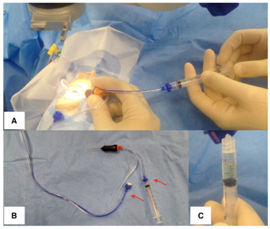 Obtaining a vitreous sample with vitrectomy. (A) The assistant is manually aspirating via a syringe while the surgeon is cutting with the vitrector. (B) The vitreous cutter shows the broken aspiration tube (arrows) connected directly to a 2 mL syringe used to obtain a biopsy. (C) Undiluted vitreous specimen obtained using the vitreous cutter.