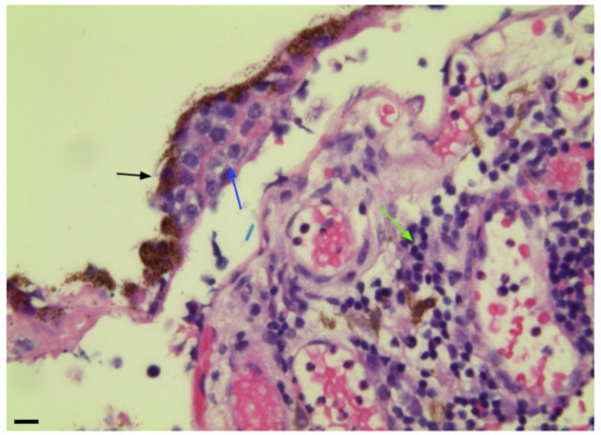 Acute inflammation is often infectious in origin and timely diagnosis and treatment are fundamental to optimize visual outcome. The causative organism, a bacterium (usually Gram-positive) or fungus, may complicate the ocular surgery (most frequently cataract surgery, followed by intravitreal injections, penetrating keratoplasty, trabeculectomy, and glaucoma drainage device implantation) or be introduced through a perforating wound (exogenous endophthalmitis). Bacillus and Streptococcus are common species found in penetrating trauma with an intraocular foreign body [44]. Other species isolated include Staphylococcus epidermidis, Propionibacterium acnes, Pseudomonas and Streptococcus, Gram−negative organisms, fungi, and mixed pathogens. Occasionally, the causative microorganism reaches ocular tissues through the bloodstream (endogenous endophthalmitis) and may be bacteria, mostly Streptococcus and Staphylococcus aureus in the majority of the population [45], and Klebsiella pneumoniae in East Asian people [46] as well as fungi, particularly Candida albicans and Aspergillus, and rarely parasites. The most common predisposing factors include immunosuppressive diseases, such as diabetes mellitus, HIV infection, long-term use of broad-spectrum antibiotics, steroids and other immunosuppressive drugs, indwelling intravenous catheters, and intravenous drug abuse [47,48]. Acute endophthalmitis manifests as a massive purulent reaction in the anterior and vitreous chambers, histologically represented by a massive granulocyte infiltrate, which can disarrange the fibro-muscular structure of the ciliary body, as illustrated in Figure 2. A common cause of noninfectious endophthalmitis is massive necrosis of a malignant uveal melanoma or a metastatic carcinoma [49].