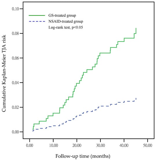 The incidence of patients undergoing TJA after GS treatment was significantly higher than that in the NSAID-treated group (OR = 3.06, 95% CI: 1.58–5.95, p = 0.001) using logistic regression analysis (Table 4).However, the GS dosage did not significantly affect the incidence of patients undergoing TJA (OR = 0.999, 95% CI: 0.996–1.001, p = 0.375). The Kaplan–Meier estimates of cumulative TJA risk on GS-treated and NSAID-treated groups are shown in Figure 1, which revealed a p-value <0.05 (log-rank test). This indicates that the GS-treated group has a higher risk of TJA than the NSAID-treated group in the database under the NHI regulations.