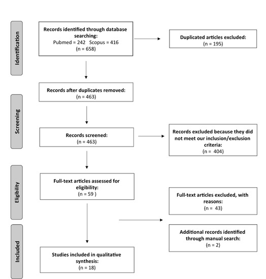The Preferred Reporting Items for Systematic Reviews and Meta-Analyses (PRISMA) workflow. Eighteen studies were considered for this systematic review.