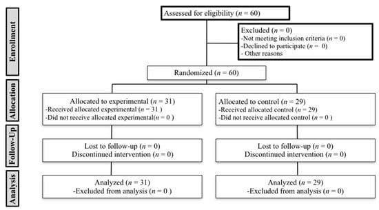Figure 2 shows details of recruitment. A total sample of 60 patients were included in the study. Thirty-one patients were randomized to the EG and 29 to the CG. Twenty-nine patients were men (15 men (48.4%) in the EG, versus 14 (48.3%) in the CG) and 31 were women (16 women (51.6%) in the EG, versus 15 (51.7%) in the CG). Patients were aged between 20 and 70 years (48.80 ± 13.80 years). The 36.7% of subjects were receiving medical treatment with proton pump inhibitors. The total sample had 4.48 ± 3.46 points on Symptoms of GerdQ test (3.79 in the CG, versus 5.13 in the EG). We found no significant differences in sample characteristics between groups. Table 1 shows the characteristics of the sample.
