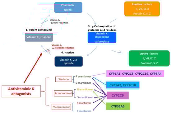 As for the genetic mutation affecting the response to VKA therapy, more than 30 genes are involved in VKA activity and metabolism; the most important and most extensively studied are CYP2C9 (the gene responsible for the enzyme mainly involved in the metabolism of S-warfarin) [,] and VKORC1 (the gene encoding the target enzyme of the medication—vitamin K epoxide reductase) [,,] (Figure 1).