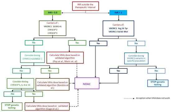 First of all, if INR values are above 3.5, we consider that patients should be tested for polymorphisms associated with sensitivity to VKA, namely VKORC1 1639G>A, CYP2C9*2 and *3 (the most prevalent in Caucasian population according to Shuen et al []. If these mutations are validated, there are two options to take into account: either integrate the clinical and genetic factors in a validated pharmacogenetic algorithm for Acenocumarol [,] and calculate the predicted dose of VKA for reaching therapeutic anticoagulation or switch directly to NOAC. But if the genetic tests are negative, an option could be to further test for the presence of CYP4F2 mutations, as it was previously mentioned that it is also linked to VKA sensibility. A positive result will determine two alternatives: switch directly to NOAC or integrate the mutant variant in a pharmacogenetic algorithm like the one proposed by []. However, if these results are negative, the third panel of mutations to be considered are those related to CYP2C9*5, *6, *8 or *11. The presence of mutant variants implies integrating it in an algorithm like the one proposed by Gauge et al. for Warfarin [] and calculate the required dose accordingly, or switch to NOAC. If there is a negative response, one should stop genetic testing and treat the patient with NOAC if affordable.