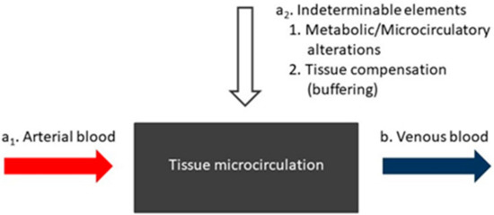 Metabolic derangement and multiple organ dysfunction encountered in sepsis have been, in part, attributed to concomitant impairment of microcirculation [6]. An equation of tissue buffering could be drawn by visualizing tissue microcirculation (black box, Figure 1) as a double-entry (a1, a2) and single-exit (b) system [1]: a1. arterial blood parameters a2. indeterminable elements related to tissue injury b. venous blood parameters.