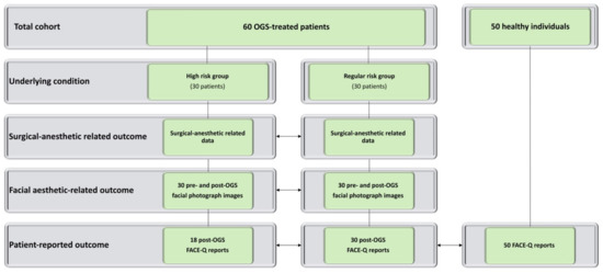 Studies that have examined outcomes across various types of surgical procedures have demonstrated that patients with a high comorbidity burden are more prone to postoperative complications, such as wound healing problems, infections, and organ- or system-related problems (i.e., problems in the vascular, urinary, digestive, and nervous systems) than those without comorbidities [25,26,27,28]. From the existing OGS-related data, patients with relatively high ASA-PS and Charlson scores or a high comorbidity burden have also been determined to be prone to complications, an extended length of hospital stay, and high medical costs [4,5,29,30,31,32]. However, differences in study design and data collection impair a reliable head-to-head comparison between our results and those of the mentioned previous studies [4,5,29,30,31,32]. Using our comprehensive OGS-specific approach, we demonstrated that achieving similar outcomes in high- and regular-risk groups is possible, with OGS-treated patients exhibiting similar FACE-Q reports to matched healthy individuals. All measured parameters (anesthetic surgical outcomes, procedure-based outcomes, and patient-reported outcomes) were considered key targets of OGS procedures [2]. Achieving this balance between risks and benefits is paramount to continue the use of this approach in our center.