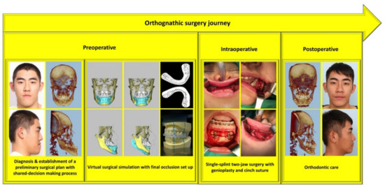 Multistep orthognathic surgery journey from the initial preoperative multidisciplinary-based consultation to reintegration into society after correction of facial deformity and malocclusion. Patient provided written consent for the use of his image.