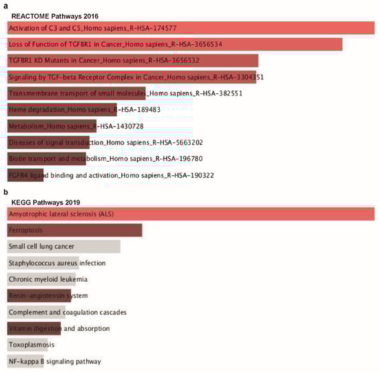 Lastly, to explore our aim of identifying possible signaling pathways from the list of co-altered genes with TTYH3 in GC/SC, we performed ontology analysis with 16 positively co-altered genes with TTYH3 obtained from the Oncomine database (Figure 7a). The top 10 REACTOME pathways obtained from the list of TTYH3 and positively correlated genes were mainly related to the activation of the complement system (C3 and C5), loss of function of TGFBR1 in cancer, TGFBR1 kinase domain mutants in cancer, signaling by transforming growth factor-beta receptor complex in cancer, transmembrane transport of small molecules, degradation of heme protein, metabolism, diseases of signal transduction, biotin transport into cells and metabolism, and fibroblast growth factor receptor 4 ligand binding and activation (Figure 8a). Furthermore, the top 10 Kyoto Encyclopedia of Genes and Genomes (KEGG) pathways for TTYH3 and its positively correlated genes were mainly related to amyotrophic lateral sclerosis, small cell lung cancer, Staphylococcus aureus infection, chronic myeloid leukemia, renin-angiotensin system, complement and coagulation cascades, vitamin digestion and absorption, toxoplasmosis, and nuclear factor-kappa-B signaling pathways (Figure 8b). These pathways might be related to tumor development and involved in GC tumorigenesis.