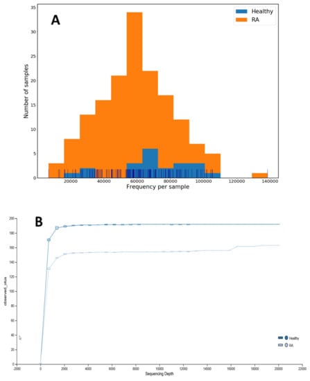 (A) The distribution of frequency of features (operational taxonomic unit, OTU) in each sample from patients with rheumatoid arthritis and healthy controls. (B) A rarefaction curve shows a correlation between numbers of OTUs and the number of sequences.