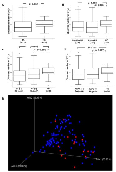 (A–D) Comparison of alpha diversity, reflected by the observed OTUs index, among RA patients with different phenotypes and HC. Active RA was defined as the 28-joint disease activity score more than 3.2. Data are presented as box-plot diagrams, with the box encompassing the 25th percentile (lower bar) to the 75th percentile (upper bar). The horizontal line within the box indicates median value respectively for each group. Principal coordinate analysis (beta diversity) of weighted UniFrac distances between fecal specimens from RA patients (in blue) and HC (in red) (PERMANOVA p-value = 0.009). OTUs: operational taxonomic units; RA: rheumatoid arthritis; HC: healthy controls; RF: rheumatoid factor; ACPA: anti-citrullinated peptides antibodies. The distribution of frequency of features (operational taxonomic unit, OTU) in each sample from patients with rheumatoid arthritis and healthy controls. (E) PCoA plot analysis (β-diversity) revealed the microbial profile distances were significantly different between RA patients (shown as blue dots) and HC (shown as red dots).