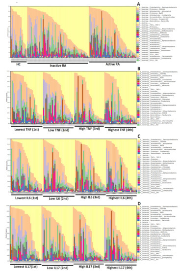 Gut microbial composition bar plots of the Greengenes class taxonomic levels from RA patients with different inflammatory cytokines and healthy controls (HC). Active RA was defined as the 28-joint disease activity score more than 3.2. TNF-α: tumor necrosis factor-α; IL-6: interleukin-6; IL-17A: interleukin-17A. Cytokine levels were stratified into 4 groups by using the quantile division.