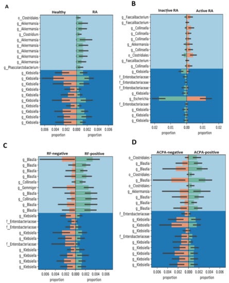 - Zhang, X.; Zhang, D.; Jia, H.; Feng, Q.; Wang, D.; Liang, D.; Wu, X.; Li, J.; Tang, L.; Li, Y. The oral and gut microbiomes are perturbed in rheumatoid arthritis and partly normalized after treatment. Nat. Med. 2015, 21, 895–905. [Google Scholar] [CrossRef] [PubMed]