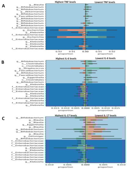 As shown in Figure 5, RA patients with the highest levels of TNF-α or IL-6 had higher proportions of Enterobacteriaceae and Klebsiella, but lower proportions of Bifidobacterium (Bifidobacterium adolescentis and Bifidobacterium longum) and Faecalibacterium (Faecalibacterium prausnitzii) than those with the lowest levels of TNF-α or IL-6. Similarly, patients with the highest IL17A levels had higher proportions of Enterobacteriaceae and Klebsiella but a lower proportion of Bifidobacterium compared with those with the lowest IL-17A levels. In addition, there were significant and positive correlations between the abundance of phylum_Euryarchaeota (class Methanobacteria) and serum levels of IL-6 as well as IL-17A (the correlation coefficient, r = 0.329, p < 0.0005; r = 0.536, p < 0.00001; respectively). Similarly, a positive correlation existed between the abundance of phylum_Tenericutes (class_Mollicutes) and serum levels of IL-6 as well as IL-17A (r = 0.431, p < 0.00001; r = 0.334 p < 0.0005; respectively).