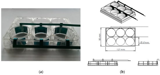 Experimental test setup. (a) The processed 6 well tissue culture plate with titanium electrodes. (b) Technical drawing of the system for capacitively coupled electric field stimulation.