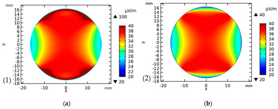 Numerical simulation of electric fields within the experimental test setup. (a) The electric field distribution simulated with COMSOL Multiphysics®, v5.3a at the bottom of the Petri dish and (b) at 1 mm above the bottom for a potential difference of 1 V. At an amplitude of 141.4 mV, the result has to be scaled by a factor of 0.1414, yielding e.g., a maximum field of about 5.7 µV/m instead of 40 µV/m at 1 V amplitude.