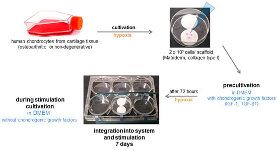 Hyaline cartilage is of high importance for the functionality of joints, it ensures a smooth and lubricated friction surface as well as the transfer of loads to the subchondral bone [1,2,3]. For these properties, the viscoelastic characteristic of cartilage, which is mainly mediated by the extracellular matrix (ECM), is essential. Further characteristics of hyaline cartilage are the limited potential for self-repair and that nutrient and oxygen supply is ensured only through fluid movement by diffusion and mechanical loading [1,4].