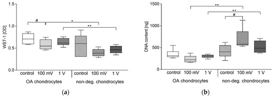 Compared to unstimulated cells, the metabolic activity (represented through WST-1 conversion) was reduced after electrical stimulation in OA and non-degenerative chondrocytes. For OA cells, this decrease was significant following stimulation with 100 mV (p = 0.0281) (Figure 4a). Comparing both cell types, a significant difference was detectable after stimulation with 100 mV (p = 0.0303) and 1 V (p = 0.0087). Here, the metabolic activity of chondrocytes derived from non-degenerative hyaline cartilage was reduced compared to OA chondrocytes.