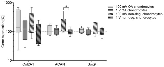 Relative gene expression of chondrogenic differentiation markers in human chondrocytes after electrical stimulation with 100 mV and 1 V at 1 kHz. Chondrocytes derived from non-degenerative (n = 4) or osteoarthritic (OA) cartilage (n = 6) were seeded on collagen scaffolds and electrical stimulation was performed over a period of seven days. Afterwards, RNA was isolated to determine the gene expression of chondrogenic differentiation markers via semi-quantitative polymerase chain reaction (qPCR). Data are presented as boxplots of the percentage of 2(−ΔΔCt) related to unstimulated cells (100%). Statistical analysis within a stimulation group was performed with Friedman test by using the ΔΔCt-values (# p < 0.05).