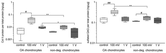 The release of Col II protein was significantly increased in OA chondrocytes following electrical stimulation with 100 mV (p = 0.0117) compared to control (Figure 6). Moreover, stimulation with 1 V led to slightly decreased protein release in OA cells compared to 100 mV. However, protein amounts were significantly enhanced compared to non-degenerative chondrocytes (100 mV: p = 0.0095, 1 V: p = 0.0381).