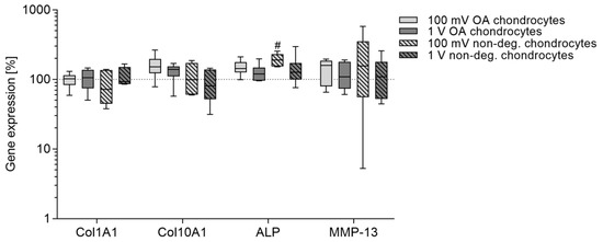 Relative gene expression rates of de-differentiation and hypertrophy markers in chondrocytes after electrical stimulation with 100 mV and 1 V at 1 kHz. Chondrocytes derived from non-degenerative (n = 4) or osteoarthritic (OA) cartilage (n = 6) were seeded on collagen scaffolds and stimulated over a period of seven days. Afterwards, the gene expression of chondrogenic de-differentiation and hypertrophy markers was determined via a semi-quantitative polymerase chain reaction (qPCR). Data are presented as boxplots of the percentage of 2(−ΔΔCt) related to unstimulated cells (100%). Statistical analysis within a stimulation group was performed with Friedman test by using the ΔΔCt-values (# p < 0.05).