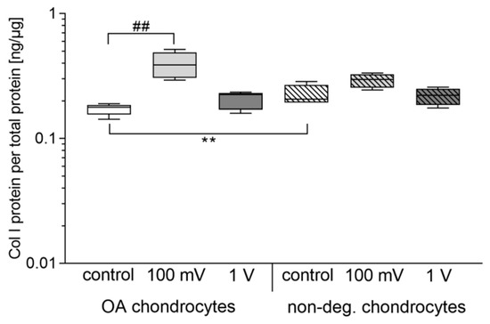 In contrast to collagen I gene expression rates, significant changes could be determined for the release of Col I protein (Figure 8). A significant difference between unstimulated chondrocytes was observed (p = 0.0095). Here, non-degenerative chondrocytes released more Col I protein than OA chondrocytes. For OA chondrocytes, stimulation with 100 mV resulted in significantly enhanced protein levels (p = 0.0016). Additionally, an upregulated protein synthesis rate was also detectable in non-degenerative cartilage cells after stimulation with 100 mV but did not reach statistical significance. However, the release of Col I protein was slightly reduced compared to OA chondrocytes stimulated with 100 mV. Stimulation with 1 V led to similar protein levels as in unstimulated controls.