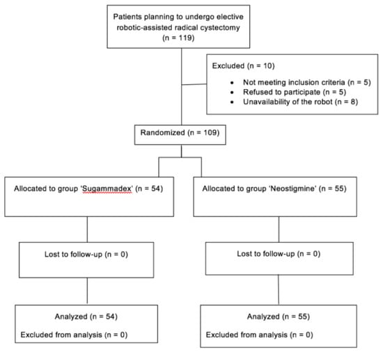 In conclusion, our results were not able to demonstrate a significant decrease of the PONV or a more rapid ROI after sugammadex administration versus neostigmine use. We observed a significant increase in MMSt values, suggesting improved quality of awakening with the use of sugammadex in patients undergoing robotic radical cystectomy. Regarding OASS observations in both groups, we obtained higher values in the group receiving sugammadex. Further studies on elderly populations and different types of surgery will be needed in the future, especially with the aim to provide a comprehensive ERAS pathway for cystectomy based on the available evidence.