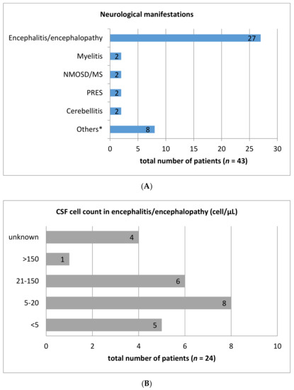 Number of different central nervous system manifestations in a total of 43 case reports of immune checkpoint-inhibitor (ICI)-mediated neurological adverse events (A). Measured cerebrospinal fluid (CSF) cell count (B) and protein concentrations (C) in the most common entity, encephalitis/encephalopathy. CSF cell count was analysed in 24 of 27 case reports with encephalitis/encephalopathy. CSF: cerebrospinal fluid; MS: Multiple sclerosis; NMOSD: Neuromyelitis optica spectrum disorder; PRES: Posterior reversible encephalopathy syndrome. Others*: Meningitis (2 cases), neurosarcoidosis (1 case), meningo-radiculo-neuritis (1 case), cerebral vasculitis (1 case), PML (1 case), central facial palsy (1 case), and brain lesion mimicking brain abscess (1 case).