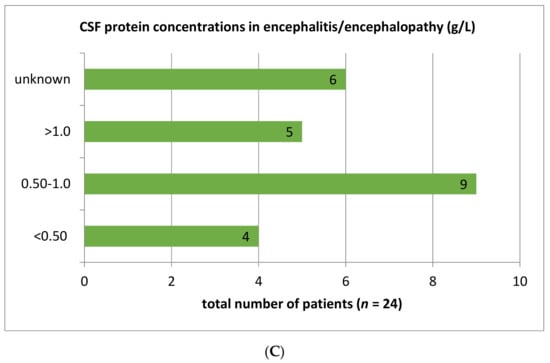 Besides these case series, CNS complications of ICI therapy have been presented in several case reports. Table S1 illustrates the published case reports up to 06/2019 regarding CNS symptoms during treatment with ipilimumab, nivolumab, and pembrolizumab. A total of 43 cases have been reported, among them 27 patients with encephalitis, two cases of cerebellitis, myelitis, and posterior reversible encephalopathy syndrome (PRES), respectively. Single case reports for meningitis, neurosarcoidosis, multiple sclerosis, neuromyelitis optica spectrum disorder (NMOSD), and meningo-radiculo-neuritis have been described as well (Figure 1A). Interestingly, gender distribution is male dominated as 31 of 43 cases (72%) are men. The mean age of patients in published cases amounted to 55.6 years (range: 26–78 years). While the most frequent indication for ICI-therapy was metastatic melanoma (44.2%), 17 patients (39.5%) were treated with nivolumab and 11 patients (25.6%) received ipilimumab monotherapy. Six patients (14%) were treated with pembrolizumab monotherapy. Combined therapy with nivolumab and ipilimumab or pembrolizumab and ipilimumab was administered in six (13.9%) and two (4.7%) cases, respectively. One patient (2%) received combination therapy with ipilimumab and lambrolizumab. Other underlying diseases were lung carcinoma (27.9%), lymphoma (11.6%), and renal cell carcinoma (7.0%), as well as single cases suffering from prostate cancer, ovarian cancer, laryngeal carcinoma, or pleura mesothelioma. Regarding the diagnostic methods, it should be noted that lumbar puncture was conducted in 34 patients (79%). In 60.5% of cases (n = 26) CSF analysis revealed elevated cell count ranging from six to 1195 cells/µL. The majority of patients exhibited a cell count between six and 150 cells (84.5%; n = 22) (Figure 1B). 22 patients (65%) exhibited elevated CSF protein concentration (range: 0.56 g/L–5 g/L) (Figure 1C). Most (88.3%; n = 38) nAEs of the CNS were treated with steroids in various dosages. Most patients received high dose (>1 mg/kg bodyweight) intravenous methylprednisolone. In nine (20.9%) and six (14.0%) cases intravenous immunoglobulins and plasmapheresis were applied in addition, respectively. In five cases no treatment was initiated. Following immunosuppressive therapy 16 patients (37.2%) achieved complete remission or major improvement of immune-related symptoms. Partial improvement was attained in 41.9% (n = 18). Unfortunately, most case reports did not quantify the residual symptoms, so that an accurate assessment of disability was not feasible. Seven patients had no amelioration of symptoms or died despite initiation of immunosuppressive treatment. Two patients were lost to follow-up.