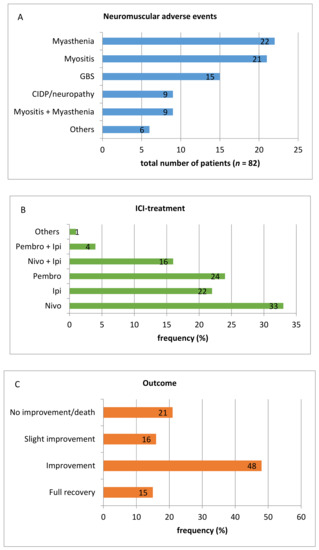 Diagnostic procedures (for example, CSF analysis, MR imaging, neurography) considerably vary among the different case reports. In 30 patients (36.6%) lumbar puncture has been performed. Of those, 19 patients exhibited elevated CSF-protein and 10 patients had an elevated CSF cell count. Almost all affected persons received oral or intravenous steroid therapy (n = 70; 85.4%). Intravenous immunoglobulins have been administered in 39 patients (47.6%) and plasma exchange was performed in 28% of cases (n = 23). In individual cases, immunosuppressive treatment options were combined with methylprednisolone and intravenous immunoglobulins, or methylprednisolone and plasma exchange as the most common combinations. Besides those options mentioned, other immunosuppressive drugs like infliximab, tacrolimus, mycophenolate, or rituximab have been applied. By far not all cases of immune-related neuromuscular adverse events were successfully treated. In 21.3 % of analysed case reports (n = 17), patients showed no improvement or even died. Only 12 patients (14.6%) fully recovered (Figure 2C). Most of these results are in line with a systematic review regarding neuromuscular adverse events associated with anti-PD-1 monoclonal antibodies conducted by Johansen and colleagues in 2019 [61].