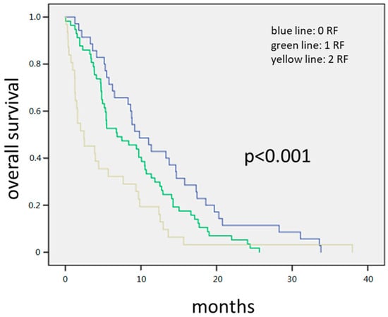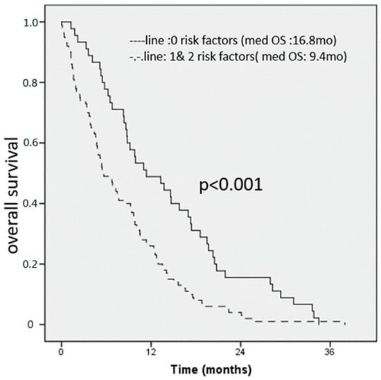 The 145 patients with complete data available for all variables. Forty-five patients had none of the above-mentioned risk factors, 65 patients had one, and 35 had both risk factors. The median OS for all patients was 8.3 months. Patients with zero risk factors had 11.3 months compared to 7.1 months with one and 3.8 months with two risk factors, respectively. Survival differences among groups were statistically significant (HR = 1.558; 95% CI = (1.26–1.95); p < 0.001).