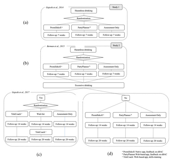 - Berman, A.H.; Gajecki, M.; Fredriksson, M.; Sinadinovic, K.; Andersson, C. Smartphone applications for university students with hazardous alcohol use: Study protocol for two consecutive randomized controlled trials. JMIR Res. Protoc. 2015, 4, e139. [Google Scholar] [CrossRef]