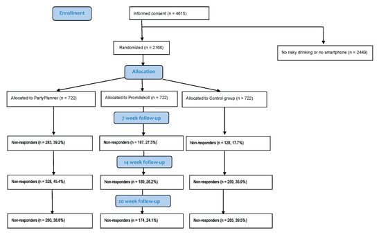 Detailed information on procedure is available in the research protocol [26] and is briefly summarized here. University students from six universities or campuses in the capital area of Sweden were invited to participate via email and Facebook pages. Potential participants were informed that completing baseline and follow-up questionnaires in the study would entail participation in one trial and include them in a lottery with three iPad devices as prizes. The rationale behind the lottery was that it is one form of compensation commonly used as an incentive to increase response rates. In this study, all participants had an equal opportunity to win the lottery if they completed all follow-ups. An invitation to participate in the add-on randomized trial for those drinking excessively at 7 weeks [27] was sent directly after the first follow-up. Interested students received more information on the add-on study and the Swedish Personal Data Act via a web page, where they could indicate their consent to participate.