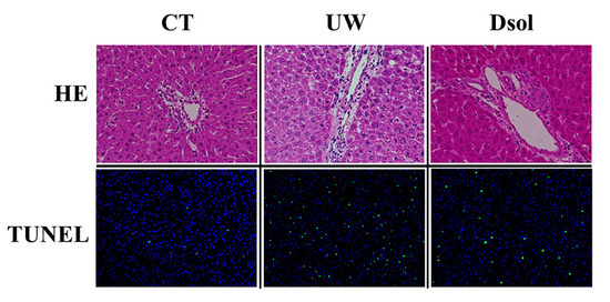 Dsol ameliorates histopathology. H&E staining (20× and 40× magnifications) showed almost normal appearance in the CT group. Vacuolization was shown in the UW group, whereas it was suppressed in the Dsol group. TdT-mediated dUTP nick end labeling (TUNEL)-positive cells were observed in the UW group, whereas they were hardly shown in the CT and Dsol groups.