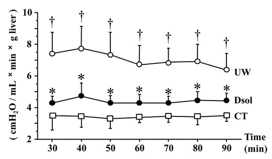 Dsol reduces portal venous resistance (PVR). PVR was the lowest in the CT group (□). It was the highest in the UW group (○), whereas it was significantly reduced in the Dsol group (●) throughout the experiment. Data were expressed as the means ± SD (n = 6). *† A p-Value less than 0.05 was considered significant: *: UW versus Dsol, † versus CT.