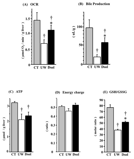 Dsol maintains hepatic functions. Oxygen consumption rate (OCR) at the end of reperfusion and total bile production during 90 min of reperfusion were determined as indices of liver function. In the CT group, OCR (A) and bile production (B) were the highest. In the UW group, they were the lowest (†), whereas the decreases were significantly suppressed in the Dsol group (*, †). In the CT group, ATP at the end of reperfusion (C) was the highest. It was significantly reduced (†) in the both UW and Dsol groups. ATP content in the Dsol group was slightly higher than that of the UW group (statistically not significant). Energy charge at the end of reperfusion was the lowest in the UW group, whereas it was almost equivalent in the CT and Dsol groups (D). In the CT group, reduced glutathione (GSH)/oxidized glutathione (GSSG) (E) was the highest. In the UW group, it was the lowest (†), whereas the decreases were significantly suppressed in the Dsol group (*, †). Data were expressed as the means ± SD (n = 6). *†A p-Value less than 0.05 was considered significant: *: UW versus Dsol, †: versus CT.