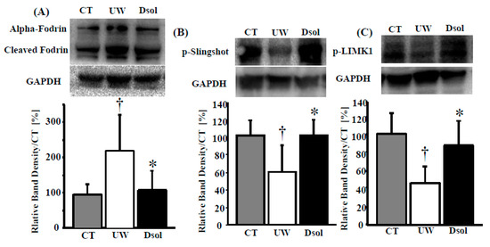 Dsol attenuates cytoskeletal breakdown. Cytosolic protein in the liver was applied to the western blot (top), and the relative intensity (bottom) was shown. Panels A–C show the results for (A) Cleaved alpha-Fodrin, (B) phosphorylated Slingshot, (C) phosphorylated LIMK1. Relative quantitation of each sample was performed, using Glyceraldehyde 3-phosphate dehydrogenase (GAPDH) as an internal control. Each normalized value was further normalized by the mean value in the CT group, and expressed as the means. *†A p-value less than 0.05 was considered significant: *: UW versus Dsol, † versus CT.