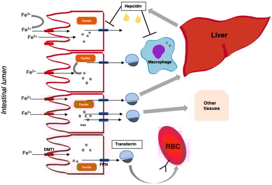 Overview of iron physiology. Non-haem iron (after reduction to Fe2+ by membrane-bound enzymes), originating from dietary intake (mostly Fe3+), enters the enterocyte of the proximal intestine via the divalent metal transporter (DMT1), and exits the cell on the basolateral side through ferroportin (FPN), which is potentiated by an oxidase, hephaestein. Depending on the state of iron need, iron can be released from the cell or sequestered in the form of ferritin (a measure of body iron stores). Iron is bound by transferrin in plasma, which enables transport and distribution to other body tissues (this also depends on the presence of transferrin receptors). Hepcidin, which is a peptide hormone produced by the liver, negatively regulates iron absorption and release from cells (e.g., macrophages) depending on iron need.