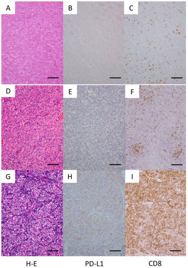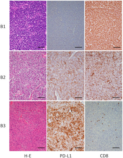 Immune checkpoint blockades are an emerging and hopeful treatment strategy for a variety of cancers [18,31,32]; however, only a subset of patients sustain clinical responses, and establishing a predictive marker for a good response remains challenging. In this context, we have begun to profile TETs for PD-L1 expression and additional immunotherapeutic markers. Here, we found positive PD-L1 expression (≥1%) in 53.9% of all surgical TET samples. None of the clinical parameters, including age, sex, smoking habit, tumor size, and stage, were correlated with PD-L1 immunoexpression, whereas there was a significant association between PD-L1-positive status and more aggressive thymomas (types B2 and B3). Furthermore, CD8+ TILs were abundantly detected in almost all TETs examined, supporting the use of an immune checkpoint inhibitor for TET treatment.