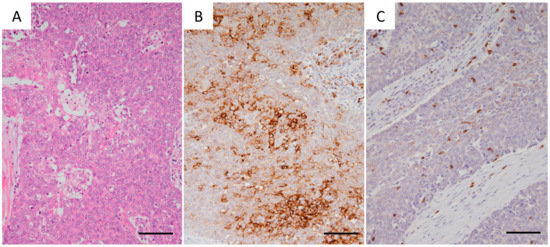 Programmed death 1 (PD-1) is a coinhibitory inducible receptor present in T-cells and macrophages [12]. Tumor cells with an increased expression of the PD-1 ligand, PD-L1, are believed to escape host immunity through activation of the PD-1/PD-L1 pathway and the consequent suppression of effector immune responses [13,14,15,16]. The PD-L1 pathway is a unique coinhibitory pathway in cancer immunology, as it is selectively expressed in tumor cells but is very rarely in normal tissue, thereby making it a principal target for immunotherapy [16]. Novel agents resulting in an immune blockade have been introduced and are now widely used in the treatment of various cancers [17,18,19,20]. In particular, monoclonal antibodies targeting PD-1 or PD-L1 exert dramatic responses in many solid tumors, particularly melanoma, lung, and urothelial carcinomas [21,22,23,24]. Clinical trials evaluating the use of these agents in the treatment of thymic carcinoma (type C thymoma) are already underway and have demonstrated promising preliminary clinical outcomes [25,26]; however, in general, the validity, efficacy, and safety of treatment with immune checkpoint blockades have not been sufficiently investigated in TETs, including in other types of thymomas. With the emerging paradigm of immunotherapy in solid tumors, PD-L1 expression in TETs should be carefully studied and analyzed.