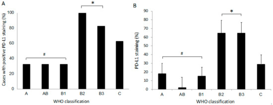 Comparison of PD-L1 immunohistochemical staining according to the World Health Organization (WHO) classification of TET. (A) Cases with positive PD-L1 staining. (B) PD-L1 staining score. * p < 0.05 compared to lower grades (#).