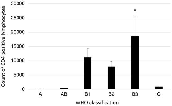 Comparison of CD4+ lymphocyte counts according to the WHO classification of TETs. * p < 0.05 compared to type A, AB, and C TETs.