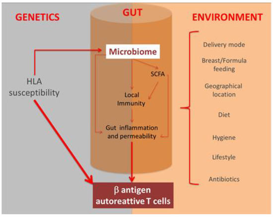 Figure 1. Interplay between genetics, environment, and gut microbiota in T1DM pathogenesis. Specific HLA allele can increase susceptibility to the development of type 1 diabetes and influence the composition of the gut microbiota. Many environmental factors can also shape the gut microbiota. Abnormalities in the gut microbiome are believed to favor autoimmunity against pancreatic b-cells by modulating the gut immune/inflammatory response and by enhancing the gut barrier permeability both directly and indirectly through reduced production of short-chain fatty acids (SCFAs).