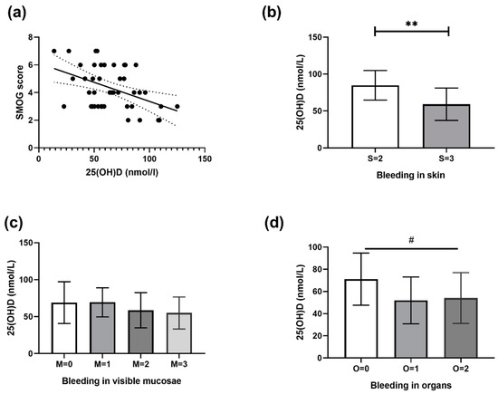 (a) Graph of linear regression between 25(OH)D value and skin-mucosa-organ-gradation (SMOG) bleeding score. The mean slope was −0.027, with the intercept at 5.99, while the 95% confidence interval (CI) was at −0.04 to −0.007 (intercept 4.6 to 7.3). R2 = 0.15, p = 0.006. (b) Difference between mean 25(OH)D values of two groups of patients with bleeding in skin (S) ratings 2 and 3 calculated with SMOG score (t test, p = 0.001, 95% CI 10.5 to 40.5). (c) Distribution of mean 25(OH)D values in groups of patients with a different severity of bleeding in mucosae using the linear trend test. (d) Distribution of mean 25(OH)D values in groups of patients with a different severity of bleeding in organs (calculated with SMOG score) using the linear trend test (slope −9.55, 95% CI −0.54 to −18.56, and p = 0.03). R2 coefficient of determination, ** 0.001 ≤ p < 0.01 for t test, # 0.01 < p < 0.05 for test for linear trend. S: Skin, M: Mucous membranes, O: Organs