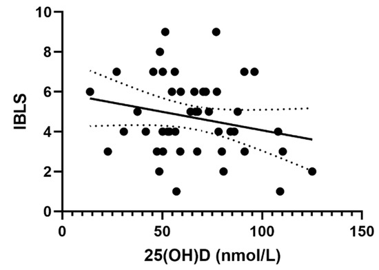 We also found negative correlation between patients’ age and 25(OH)D values (Pearson r = −0.42, p = 0.003), i.e., older patients have lower 25(OH)D values. There was no difference in 25(OH)D values between genders (the median 25(OH)D value for males was 70 ± 25, and for females 62 ± 22, p = 0.25).