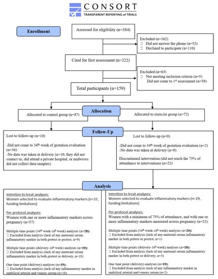 From the 159 women that participated in the study and were allocated to the control (n = 87) or intervention (n = 72) group, 10 controls dropped out of the study because of: moving to another city (n = 1), unwillingness to continue (n = 7) or unknown reasons (n = 2). In the control group, 36 women did not come to the evaluation (34th week) because of personal reasons. Data loss (n = 10) at delivery was related to women who did not contact us, attended private hospitals, or midwives who did not collect data/samples. Because of funding limitations, the inflammatory markers could only be analyzed in a subsample (n = 66). Hence, 37 and 29 women from the control and exercise group (respectively), were included the intention-to-treat analyses (Table S3). Of the 29 women in the exercise group, only 21 attended 75% of the sessions.