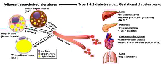 The Special Issue “Pathogenetic and Therapeutic Significance of Adipokines in Diabetes” aimed at providing new pathophysiological insights into adipokines in diabetes (Figure 1). This editorial will review six papers published as one review and five research articles in the Special Issue [,,,,,]. As a review article, Lee et al. recently defined the range of adipokines as adipose-derived secretion factors []. Adipose tissues are categorized into two types: white adipose tissue (WAT) and brown adipose tissue (BAT), according to their morphology and function [,]. Secretory bioactive molecules from WAT and BAT are referred to as “adipokines” and “batokines”, respectively [,]. In their study, the authors mainly sought to update and report new adipokines and batokines []. Additionally, they reported that exosomal miRNAs are released from adipose tissues and regulate various metabolic events in an endocrine manner []. Therefore, they described that adipose-derived signals, as a broad concept of adipokines, involve adipokines, batokines, and exosomal miRNAs []. Further, they suggested that adipose-derived factors would be biomarkers for the diagnosis and prediction of the risk for both obesity and type 2 diabetes []. As a totally new perspective, this study provided an opportunity to establish a novel role of adipokines as an endocrine organ.