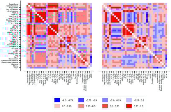 Correlation heat map of the association between NMR-assessed lipoprotein subclass profiles and clinical variables in healthy participants (left panel) and in participants with T1DM (right panel). HDL: high-density lipoprotein; LDL low-density lipoprotein; VLDL: very-low-density lipoprotein; VLDL-C: cholesterol content in VLDL; VLDL-TG: triglyceride content in VLDL; VLDL-P: VLDL particles; LDL-C: cholesterol content in LDL; LDL-TG: triglyceride content in LDL; LDL-P: LDL particles; HDL-C: cholesterol content in HDL; HDL-TG: triglyceride content in HDL; HDL-P: HDL particles; BMI: body mass index; WHR: waist-to-hip ratio; eGDR: estimated glucose disposal rate.