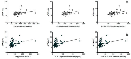 In healthy participants, aPWV was positively associated with NMR-based LDL subclasses (r = 0.328, p = 0.036 for total LDL; r = 0.364, p = 0.020 for medium LDL and r = 0.338, p = 0.031 for small LDL particles), LDL cholesterol content (r = 0.309, p = 0.049) and conventional LDL cholesterol (r = 0.353, p = 0.022) and triglyceride concentrations (r = 0.332, p = 0.032) (Figure 2, panel A) but these associations were lost after additional adjustment for classical cardiovascular risk factors (age, gender, smoking, hypertension, dyslipidemia and BMI) (Table 3).